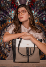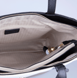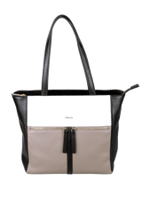Daliah is a tricolour (black, white and grey) Di Valdi handbag with refined hardware and a DV logo charm.